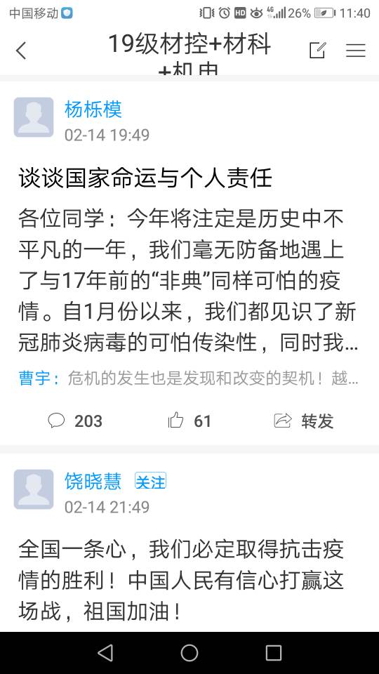 运用网络主题班会,做好思想引路人 在这场看不见硝烟的“战疫”中,社会涌现出无数一线医务人员和 “抗疫”工作者的感人故事。老师们通过QQ群、微信群、钉钉、学习通等线上平台,展开了热烈讨论,让同学们深刻体悟这个特殊时期爱国主义闪耀的光芒,引导青年大学生积极承担起社会责任,学会感恩和敬畏生命。同时,引导学生合理规划学习和休闲时间,做到“宅家”不懒散,“停课不停学”。在这个特殊时期,毕业班辅导员们,及时督促学生关注考研成绩公布和线上招聘渠道,尽量减少毕业生的思想焦虑,确保毕业生的安全稳定。
