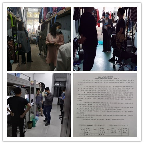 5月10日当天,学院组织青年教师和辅导员成立党员先锋队积极投身学校防疫服务工作,为首批返校学生测体温、检查健康码。毕业班辅导员提前清点防疫物资,安排专员领取,确保物资领取工作安全有序。学院领导带队分四组前往学生宿舍,实地了解返校学生们的健康状况、考研就业情况,同时要求学生们认真阅读签署“机械与汽车工程学院疫情防控期间毕业生管理承诺书”,严格遵守学校疫情防控规定,注意自我防护,安心学习生活。