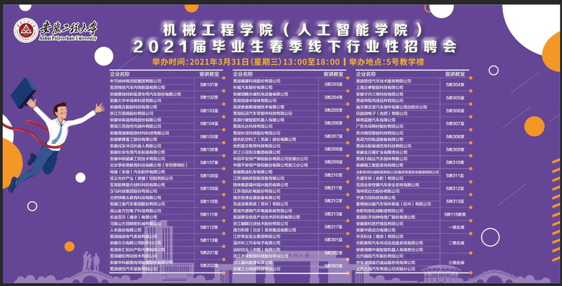 3月31日下午,在学校大学生就业创业指导中心的指导下,筹备了近一个月的机械工程学院(人工智能学院)2021届毕业生春季线下行业性招聘会在5号教学楼成功举办。来自江苏、浙江以及安徽省内装备制造业和人工智能相关产业共88家企业进场招聘,为毕业生提供了一千多个就业岗位。