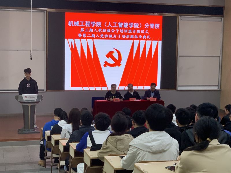 为贯彻落实党员教育管理工作有关要求,加强对入党积极分子的教育与培养,4月17日,机械工程学院(人工智能学院)分党校举行了第三期入党积极分子培训班开班仪式暨第二期入党积极分子培训班结业典礼。院党委书记伊长文、副书记何志恒、培训班班主任、全体培训班学员以及第二期培训班优秀学员代表参加本次活动。开班仪式和结业典礼由何志恒主持。