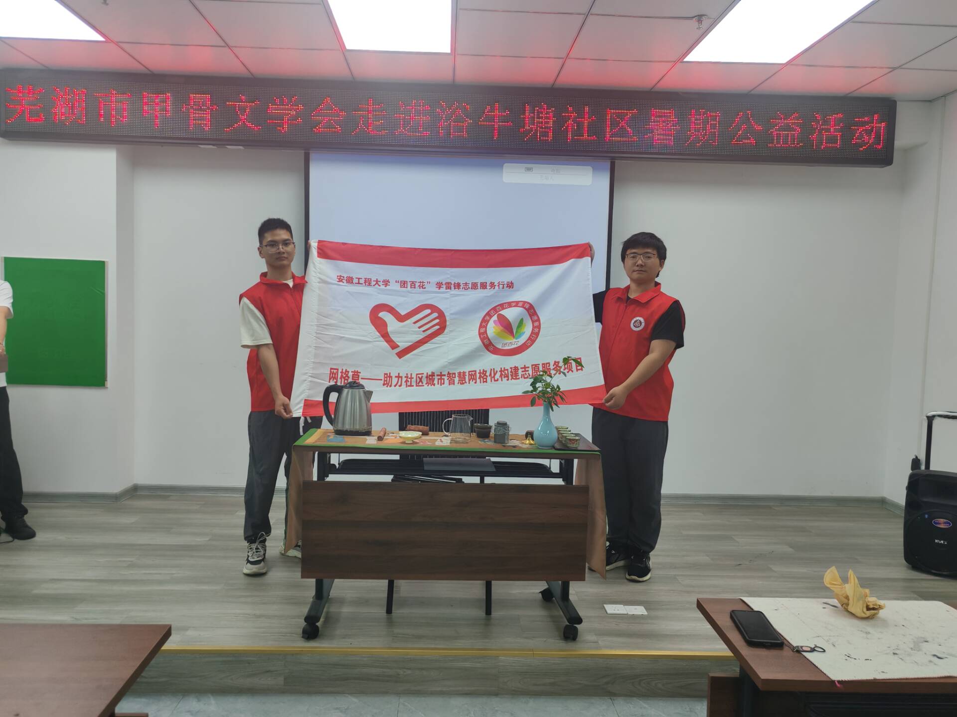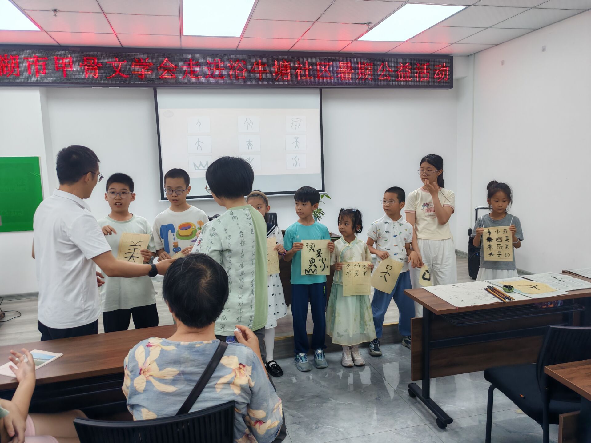 7月21日,安徽工程大学青芒课业护航服务团队走进浴牛塘社区,协助甲骨文学会举办以“探秘甲骨文·传承中华魂”为主题的暑期“三下乡”实践活动。20名社区青少年齐聚一堂,在志愿者们的精心组织下,通过生动有趣的活动,沉浸式体验甲骨文与中华茶文化的独特魅力,在实践中受教育、长才干、作贡献,助力社区文化建设与青年学生成长。
