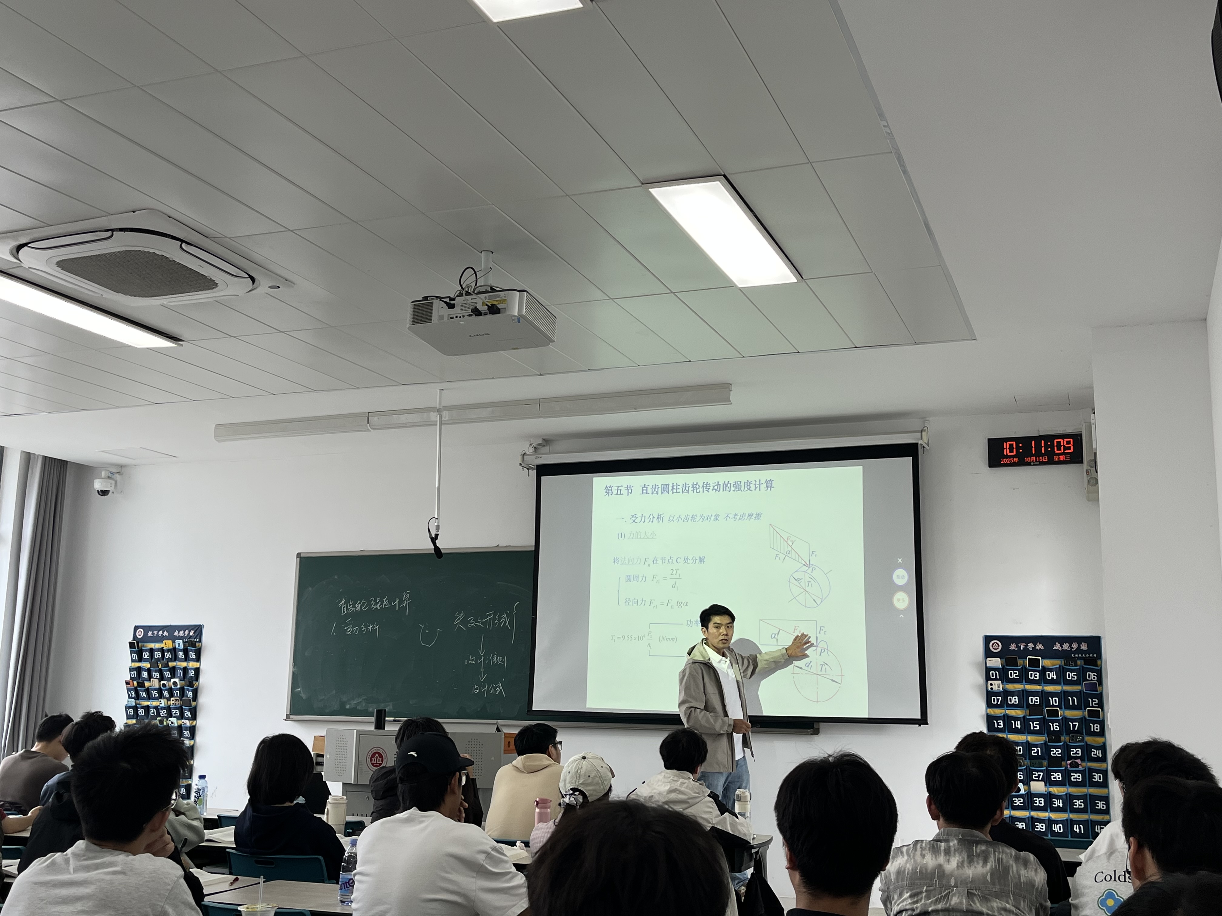 徐锐老师以“直齿圆柱齿轮传动的强度计算”的内容展开教学。课程伊始,他通过互动提问,引导学生回顾上节课所学的齿轮类型、失效形式及设计准则等关键内容,并自然引出“如何运用设计准则进行直齿圆柱齿轮传动的强度计算”这一核心问题,顺利过渡到新课讲授。随后,徐老师从齿轮的受力分析与方向判断入手,系统讲解了齿面接触疲劳强度和齿根弯曲疲劳强度的计算方法。在教学过程中,他灵活运用动画演示与典型例题分析,有效加深了学生对知识要点的理解。此外,徐老师还借助学习通智慧教学平台开展课堂互动,实时掌握学生学习情况,充分调动了学生的积极性与参与感,课堂氛围活跃。整堂课备课充分、条理清晰、讲解熟练,多种教学方法的有机结合显著提升了教学效果,赢得了观摩教师和学生的一致好评。