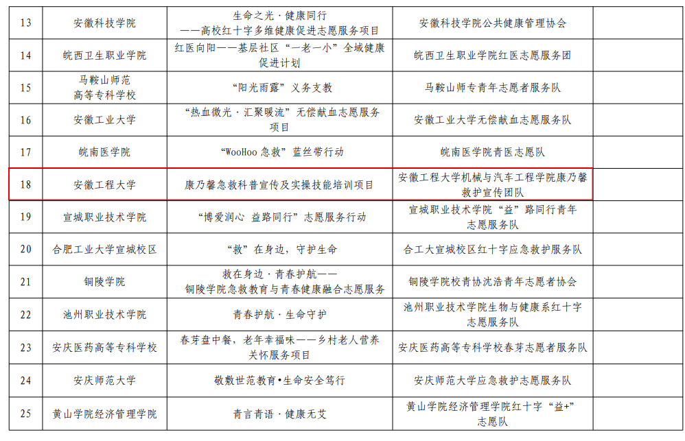 安徽省红十字会公布2025年“生命教育・益行计划”高校红十字志愿服务项目和青年发展计划支持名单,安徽工程大学机械与汽车工程学院康乃馨救护宣传团队申报的“康乃馨急救科普宣传及实操技能培训项目”成功入选,获得专项资金支持。