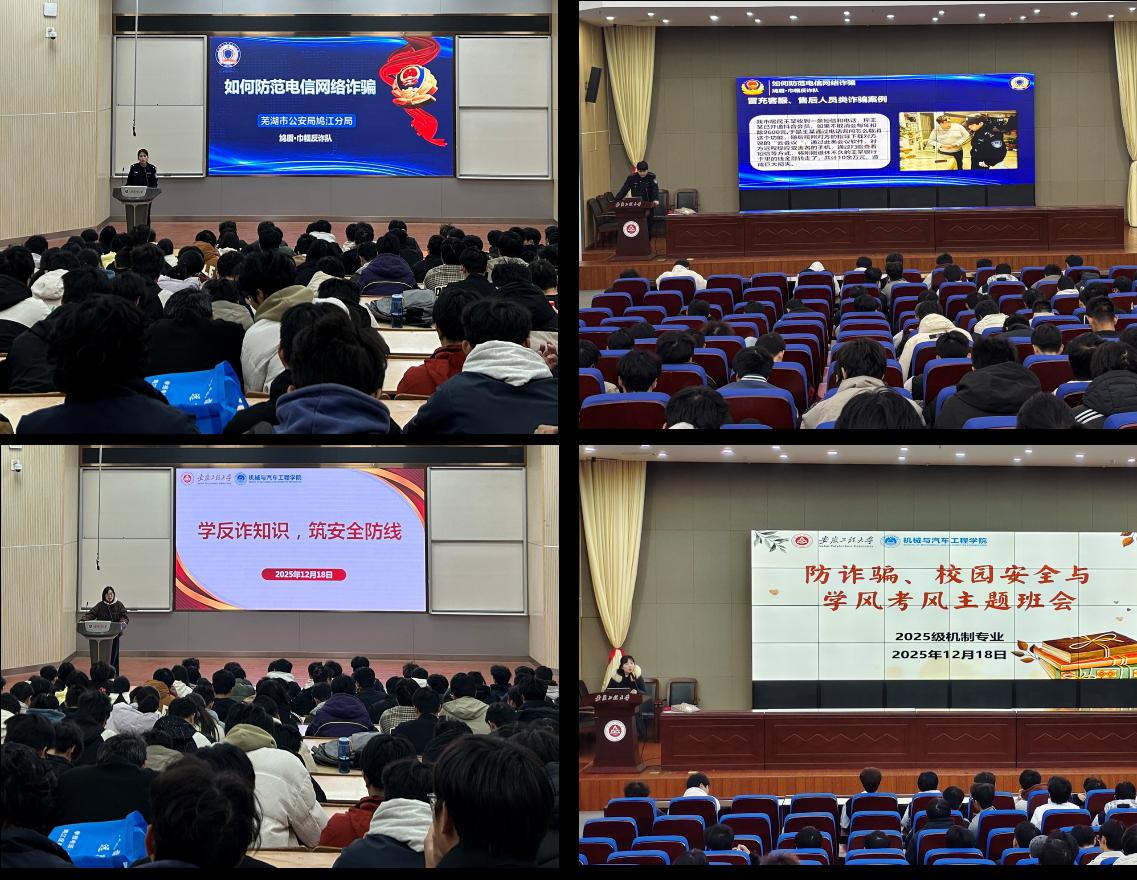 为庆祝学校九十华诞,落实“平安社区,献礼校庆”安全教育要求,12月18日,机械与汽车工程学院在二教报告厅和图书馆五楼报告厅举办反诈骗专题宣讲暨情景剧展演活动。活动特邀鸠江公安分局鸠盾·巾帼反诈队民警郭警官、城东新区派出所张警官主讲,反诈情景剧《爆裂无声》团队献演,以“专业宣讲+沉浸式体验”模式,助力学子认清诈骗套路、强化防诈意识、筑牢安全防线。