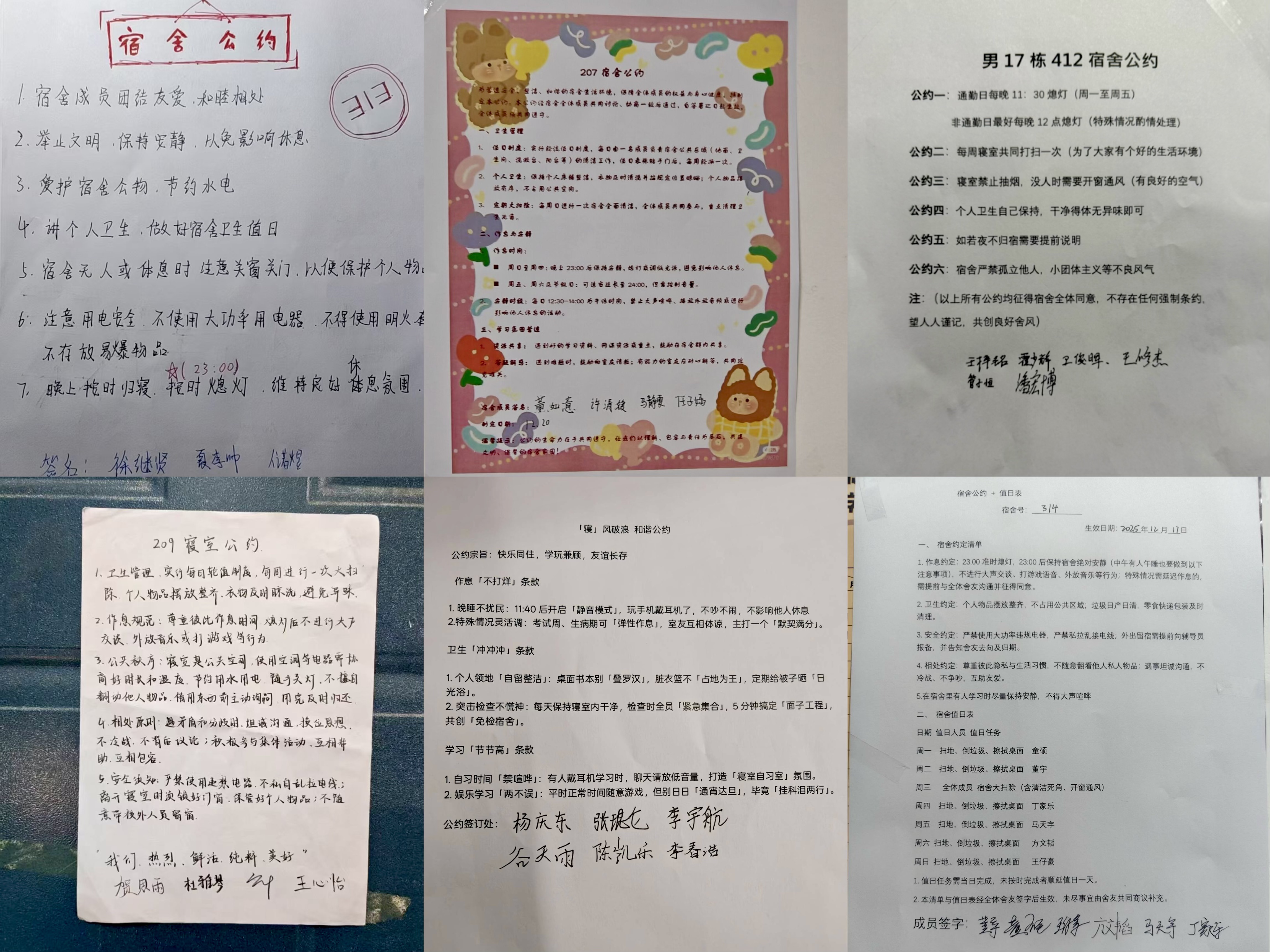 活动以宿舍为单位,组织学生结合学习生活实际,共同制定或修订宿舍文明公约。公约内容在涵盖作息时间、卫生轮值与学习氛围等基础模块的同时,积极融入九十周年校庆元素及宿舍安全、消防安全、防诈骗等专题内容,充分激发了学生的创造力与主体意识。各宿舍通过手绘海报、艺术排版、集体签名设计等创意化形式,将公约转化为兼具规范性、审美性与宿舍特色的“室内文化标识”。所有学生宿舍均已完成全员签字确认,并将公约张贴于宿舍公共区域,成为大家共同遵守的集体承诺。