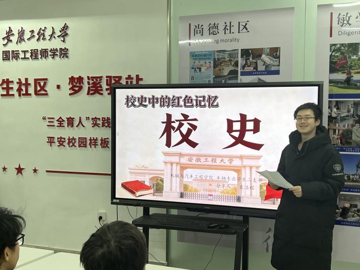 分享会中,袁浩程、陆地、张逸飞以及韩嘉乐同志,向党支部同志们娓娓道来了许多。无论是1983届校友曹锦芬、赵国庆夫妇为期13年的10万里“红色骑行”;还是感悟王稼祥同志“执着真理、引路前行”的机械与汽车工程学院“械启红途”实践队;亦或是前往六安金寨双河暴动旧址聆听洪学智将军战斗故事的学院实践团;这些事例无一不彰显了安徽工程大学师生“爱国信党”的坚定信念,无一不寄托了对历届学子“赓续奋斗精神、勇担时代使命”的殷切期望。