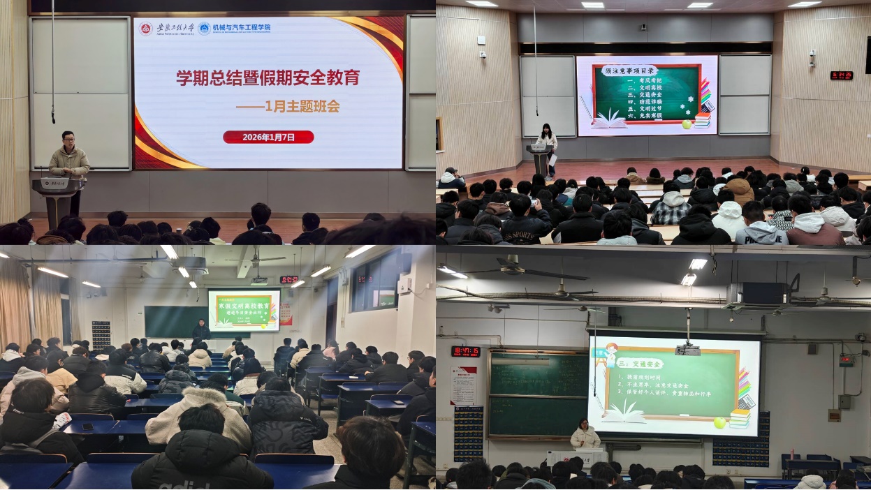 2026年1月6日至7日,机械与汽车工程学院分批次召开了2025-2026学年第一学期总结暨寒假安全教育年级大会。会议在回顾与肯定同学们本学期适应成长与学业收获的基础上,聚焦即将到来的寒假与新学年规划,围绕安全、实践与发展三大主题展开全面部署与深入交流。