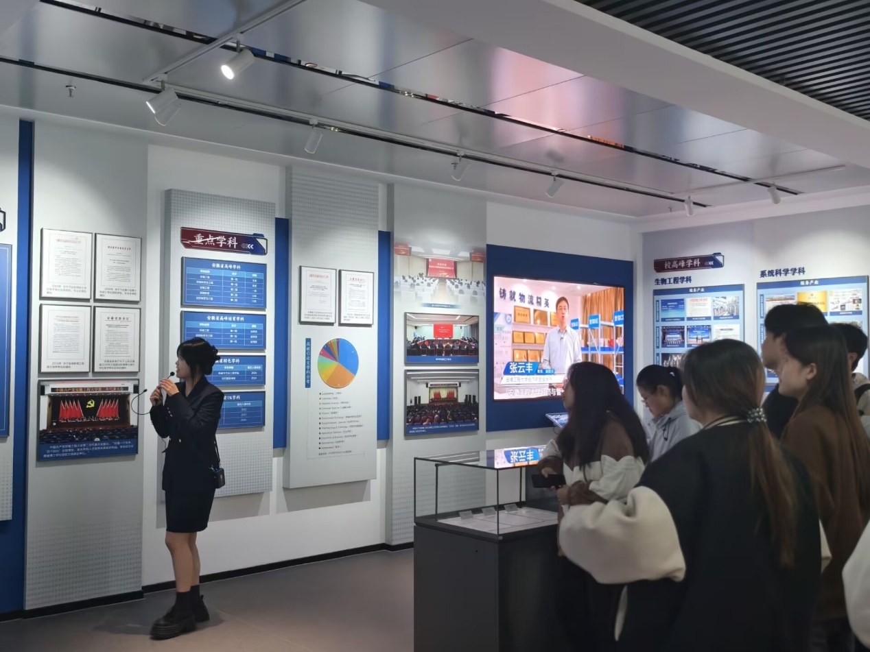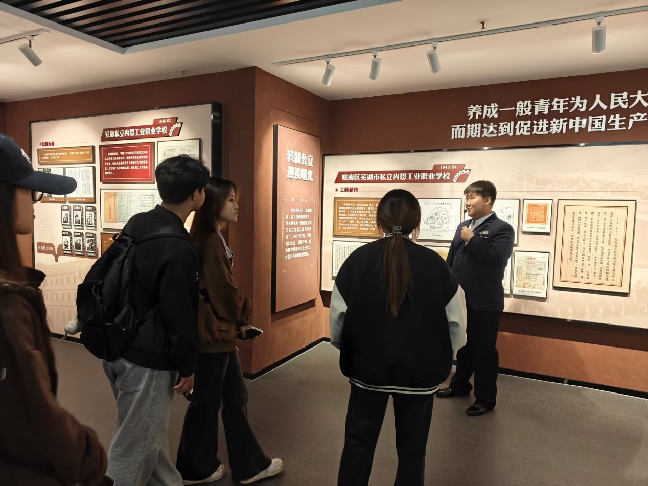 在讲解员的引导下,同学们沿着校史长廊驻足观看。一幅幅珍贵的历史照片、一件件承载岁月印记的实物展品,系统呈现了学校从1935年安徽私立内思高级工校发轫,历经芜湖电机制造学校、芜湖机械学校、安徽机电学院、安徽工程科技学院等办学阶段,至2010年更名安徽工程大学至今的九十余年峥嵘岁月。同学们深切感受到学校深厚的历史积淀和代代相传的奋斗精神。